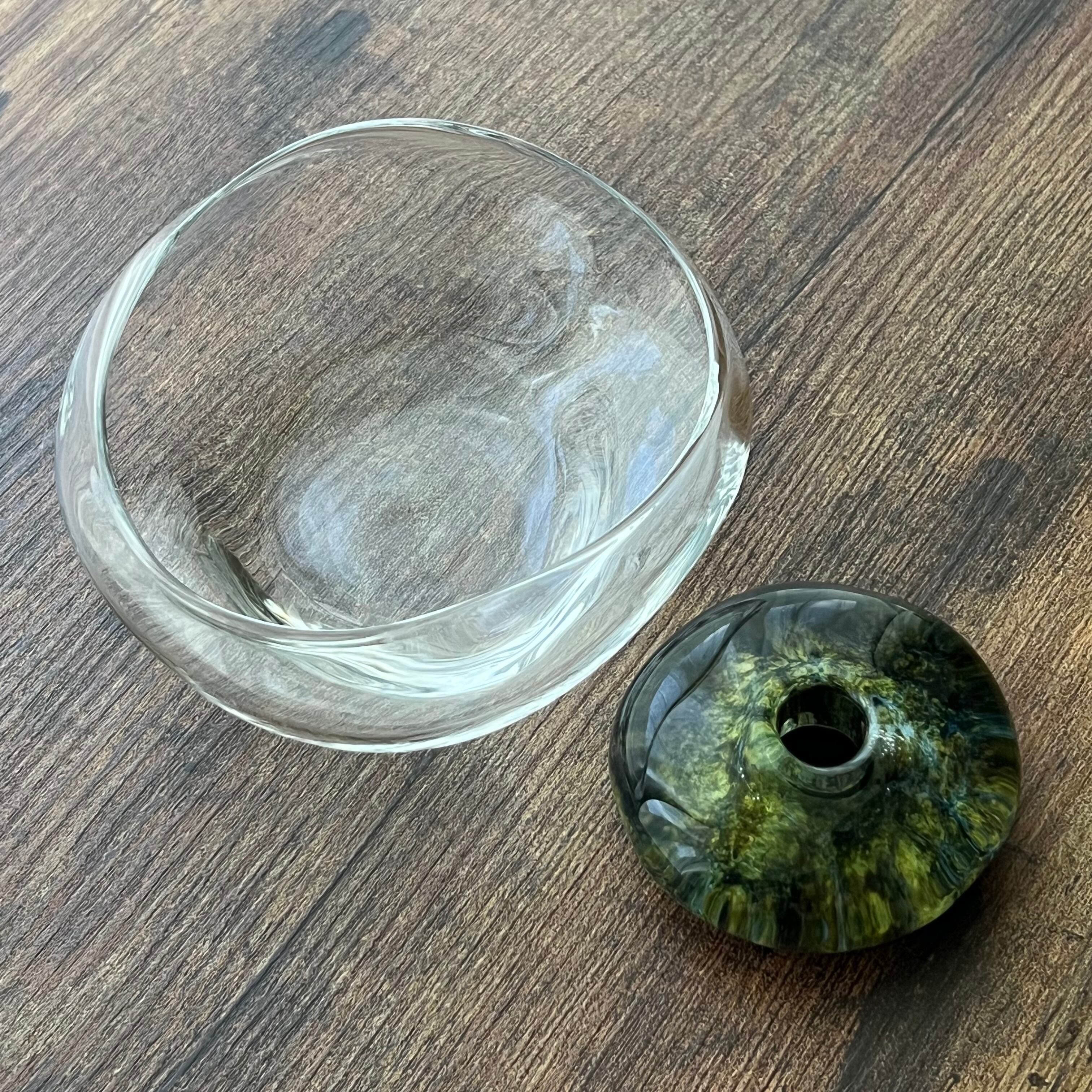 浅く水を張ると、この作品ならではの魅力を感じることができます。満水にしても、器の外側からの見え方が変わるので、お好みで飾っていただけたらと思います。